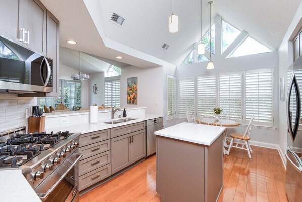 This condo is a true gem! It was elegant, serene, exceptionally well-decorated and, we felt, located in the most desirable area within the community. The whole experience was like we were in a resort: On one hand it was a peaceful retreat for us - the lanai was our private oasis where we could sip our morning coffee and unwind at sunset over a cocktail gazing at a serene water view. At the same time there was a large pool, hot tub, clubhouse and workout room within steps of the front door. There were great restaurants and large, white powdery-sand beaches a short drive away, and thirty golf courses within thirty minutes. On top of that, we had access to the spa, complete fitness center, tennis and pickle ball courts in The King and Bear community. The kitchen in the condo was great! All the appliances seemed new and included a 5-burner professional gas range. The beds were plush and inviting and the master bathroom looks as though it was recently renovated. Everything feels fresh, new, and immaculately clean. Marilyn is an outstanding host—gracious, attentive, and always ready with a great recommendation. A luxurious stay in every sense. A 5-star experience.