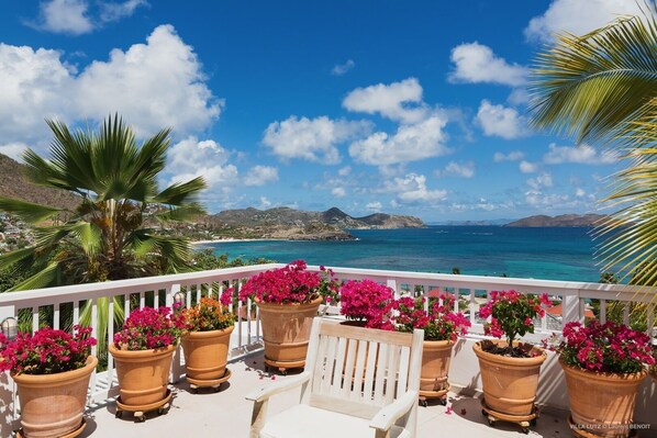 On the lower level, there is a second terrace with a beautiful swimming pool perfect for swimming and relaxing in a lovely setting of palm trees and colourful flowers. Deck chairs and tables are set up around the pool for delightful moments of rest and sunbathing sessions under Saint Barth's sun. Upstairs, the large terrace opens onto the living room and provides a very private space featuring a comfortable outdoor living room furnished with sofas and cushions, as well as tables and chairs. Ideal for a family or group of friends, vacation house Luz has four beautiful, tastefully decorated air-conditioned bedrooms. All have king-size beds and en-suite bathrooms. One bedroom is on the main level and adjoins the living room. Two others are on the lower level and open onto the terrace and the pool. The fourth bedroom is in a separate bungalow located slightly lower for maximum privacy.