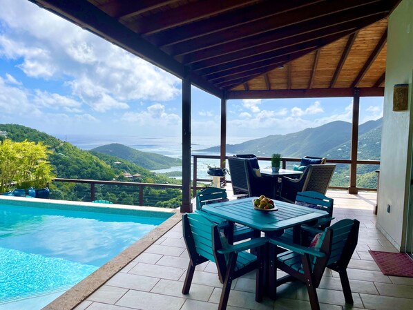 Life can be slowly savored at Coral Sky Villa, morning coffee on the decks, a rum and tonic by the pool in the tropical sun, a canopy of a million stars at night. We offer large outdoor covered patios and open sun decks with amazing views of Coral Bay and the British Virgin Islands. A gated entry leads to a beautifully landscaped villa that sits perfectly across the lot.