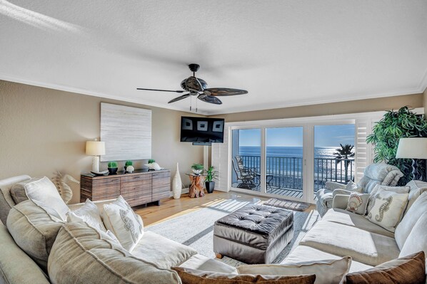 Sleeping accommodations include one king in the main bedroom and 2 queen beds in the 2nd bedroom. Both bathrooms offer single sink vanities. The main bath offers a walk-in shower. There is a tub shower combo in the other bathroom. 304 has a Washer/Dryer, Central heat/air conditioning along with ceiling fans.