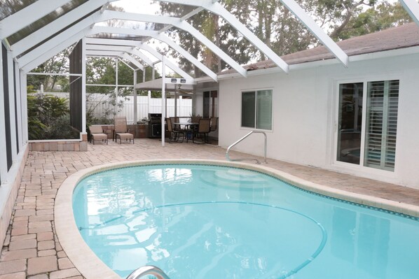 The quiet neighborhood (last house in a cul-de-sac) surely guarantees peaceful evenings at the pool side, barbecuing on a high-quality Weber grill and enjoying the warm Florida evenings outdoors protected by a covered porch. During the day, you’ll appreciate the shaded secluded pool area while sipping on your favorite drink and relaxing in the pool.