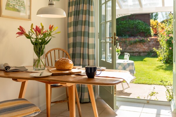 You enter the cottage from the off road courtyard, where you can park your car, and through a gate into the pretty back garden. The kitchen breakfast room opens out through French doors onto a glass covered patio where you can enjoy a meal in comfort looking out into this lovely walled ‘Cottage’ garden.