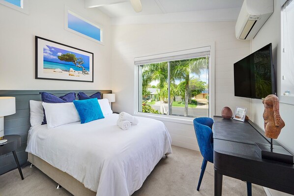 Each guest has quality fresh bath and beach towels supplied and all rooms have sliding door mirrored built in robes with shelves and hanging space. The Upstairs Bedroom with mountain views, also has a work desk and a 42” Sony UHD flat screen TV with Netflix, Stan , Prime & Disney+. The Bottom room also a TV with access to same services. Air conditioning in top 2 bedrooms plus all rooms have Fans and heaters (winter) are also supplied. Iron and ironing board, Hair dryer and shower gel, shampoo, conditioner are provided as well.