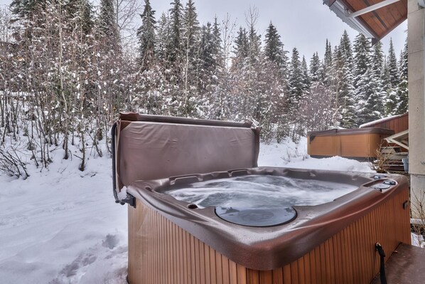 Outdoor spa tub - Multi level 2 bedroom condo, ground floor entrance, close to village center and next to ski runs (Sun Peaks)