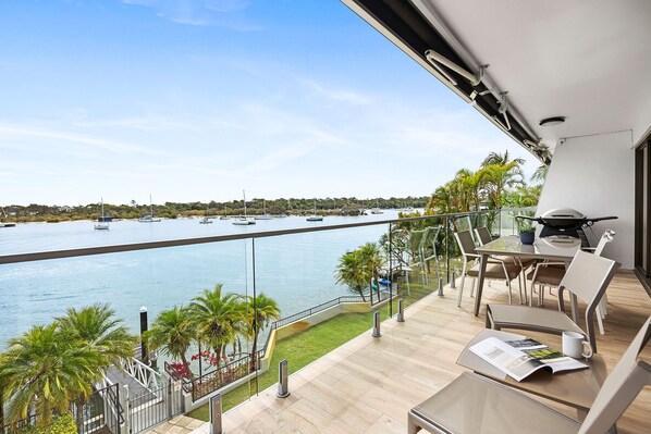 This apartment has just undergone a complete renovation and transformation. When the first sight that claims attention as you walk through the front door of your apartment is the glint of warm sunlight on beautiful emerald waters, you know you’ve found something special in your home away from home. And at this stylish apartment in Noosa Heads, the panorama is only the beginning. Part of an absolute waterfront complex that stretches along the Noosa River, the two-bedroom property holds a prime position on its mid-floor. And its appeal stretches seamlessly from the outdoors to the in.