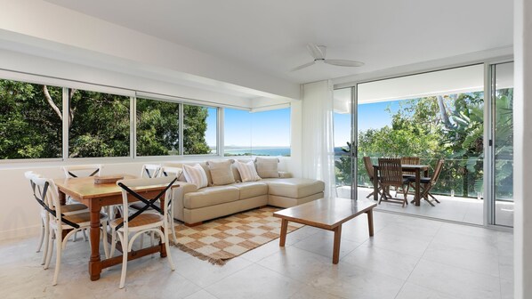 The Duplex - This air-conditioned apartment features air conditioning, a balcony overlooking the rainforest and a magnificent view of Laguna Bay Noosa and the North Shore. There is a lounge with TV and NBN wi-fi access. The kitchen is equipped with dishwasher, microwave, dishes with utensils, refrigerator and toaster. Sliding doors lead out to a fantastic versatile covered balcony with gas barbecue and outdoor furniture.