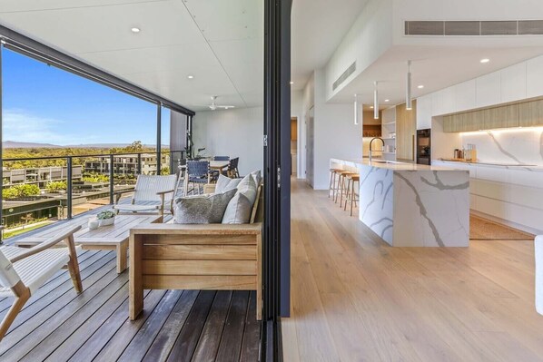 The captivating scenery of the lake beyond is a calming backdrop for the open plan living space, dining, and kitchen, with the indoor spaces seamlessly flowing out onto the expansive balcony.