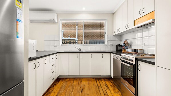 The fully appointed kitchen is equipped with cooking utensils, crockery, cutlery, microwave, a Nespresso compatible pod coffee machine, toaster, kettle, etc. plus a double sink, fridge, dishwasher, electric oven and cook top.