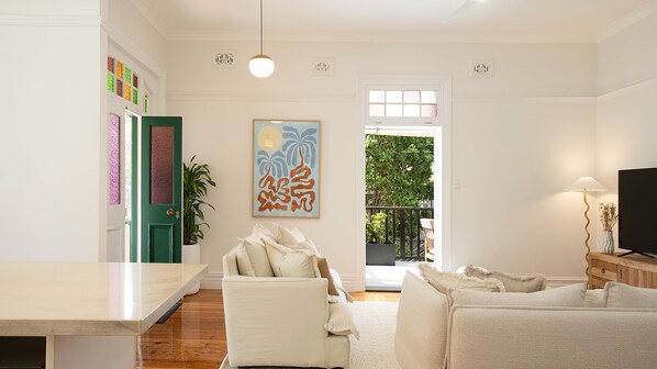 Living & Entertaining The heart of the home flows across an open plan living and dining area, where natural light pours through large windows, ceiling fans keep the coastal breeze circulating and double brick walls keep the interior naturally cool. This expansive space effortlessly accommodates gatherings of all sizes. Step out to your private balcony, complete with BBQ facilities, where sun loungers invite you to soak up the sunshine or unwind with sundowners as the day fades. The lower ground floor extends your living space with additional room to spread out, featuring a versatile queen sofa bed, direct access to the garden and a desk with smart monitor. The smart monitor doubles as a smart TV, or a monitor for your computer - perfect for work or entertainment.