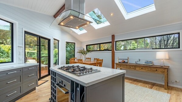 The open-plan living and dining spaces invite relaxation, with plush furnishings, a T V, and Wi-Fi for entertainment, plus a selection of books, DVDs, and games for cozy nights in. The fully equipped kitchen features a gas cooktop, large oven, dishwasher, microwave, and fridge/freezer, along with a second bar fridge—perfect for entertaining or preparing family meals. Step outside onto the spacious timber deck to dine al fresco or simply unwind while overlooking the lush, fully fenced backyard.