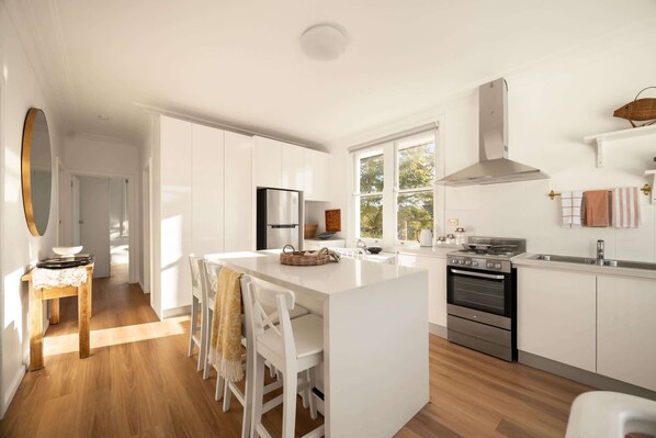 With a 2-level layout, the upstairs open kitchen serves as the central hub of the home, featuring a countertop dining area that seats four on stools, with additional seating available on the upstairs landing, accommodating up to eight guests to dine or gather comfortably.