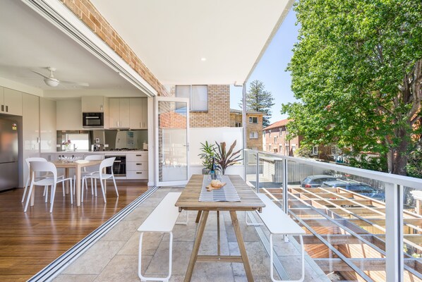 Slide open a wall of glass doors and let fresh air pour in from a spacious shaded terrace. The open-plan living space is modern and airy, with modern kitchen and laundry. Walls are filled with art inspired by the beach. And the beach is a short stroll away.