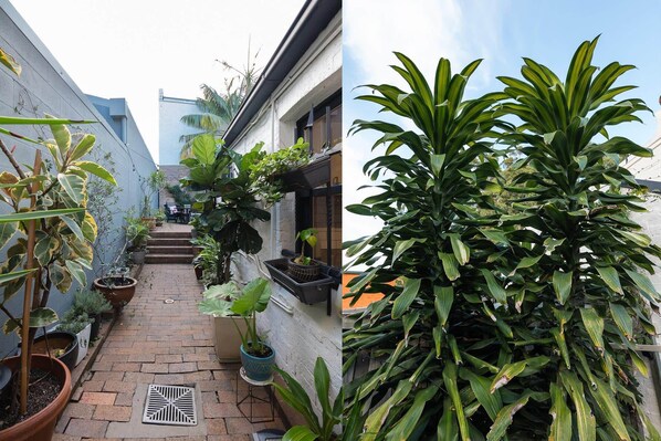 There is a large outdoor area that is full of plants and outdoor lounge and table for seating for 6-8 people comfortably.