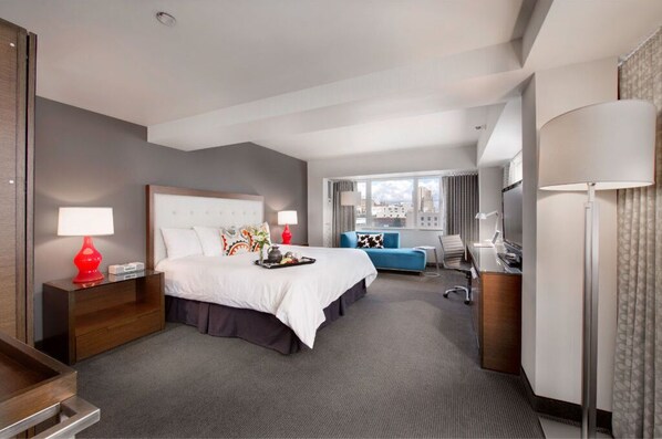 Welcome to the 575 ft² Corner King, a quiet and spacious corner room, which features: