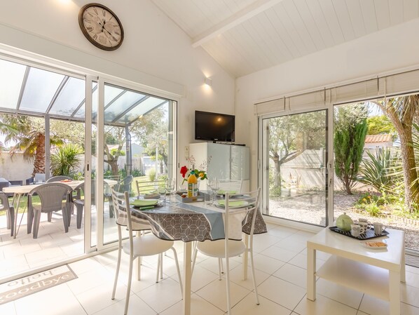 Terraced house "Les Oliviers". In the district of Le Querry Pigeon, 6 km from the centre of Talmont-Saint Hilaire, 16 km from the centre of Les Sables d'Olonne, in the residential district, 1.3 km from the sea. Private: property 300 m2 (fenced) with lawn and trees. Pergola, parking on the premises. Shop 300 m, supermarket 6 km, bus stop 6 km, sandy beach "Le Veillon" 1.3 km. Sports harbour 1.3 km. Nearby attractions: Port Bourgenay 1.3 km.