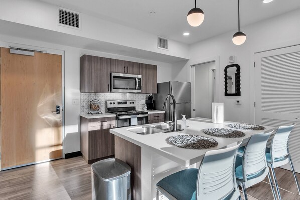 -Fully equipped kitchen with stainless appliances including a refrigerator, stove/range, dishwasher, and microwave with an oversized bar for serving meals or entertaining. Essentials included consist of cookware, Keurig pod coffee maker, houseware, linens, and more.