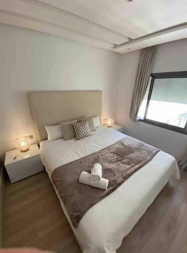 In the heart of Tangiers, this modern two-bedroom apartment offers convenience and luxury. Stroll to nearby beaches or explore City Centre Mall and Ibn Battuta Mall within a 10-minute walk. With plush towels, toiletries, aircon and WiFi throughout you can enjoy a comfortable stay in style.