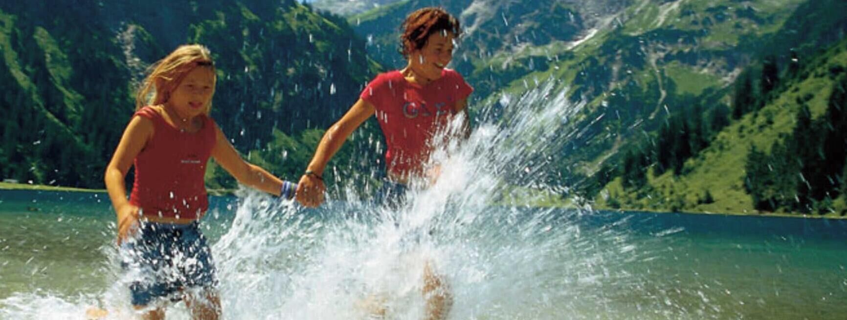• Vilsalpsee (Vilsalp Lake) at Tannheimer Tal, beautiful mountain scenery in Alps at Tannheim, Reutte, Tirol - Austria