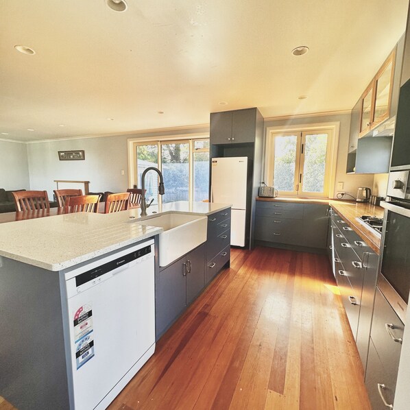 Through a gate and up a few steps will lead you to the main house. Our home welcomes you into one of two living spaces. On entry you will come into the open plan kitchen well equipped for large groups, dining space seating 6 with 4 additional chairs, and first lounge with a gas fire to keep you warm on those cooler nights. A smart TV is also within this space for you to enjoy. Leading off the dining area is a ranch slider opening up to the large back deck. With an outdoor dining table and chairs along with a gas BBQ, memories are often created out here. There is also a heated outdoor shower around the corner great for rinsing off and warming up on cooler days after a dip in the lake.