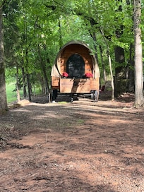 On the Mulberry River in Oark, Arkansas, The Sparrow offers a one-of-a-kind glamping experience. Stay in our cozy Covered Wagon and enjoy modern comforts like WiFi, a Queen size bed with A/C and Heat, TV, full bathroom amenities including coffee maker and microwave.