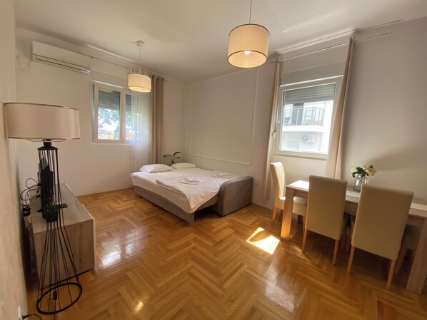 Enjoy a peaceful stay at this marvelous 1-bedroom apartment in Tivat. The apartment features 1 queen bed, 1 bathrooms with a bathtub, and a cozy living room with a sofa bed. Guests can take advantage of amenities like an iron, washing machine, hair dryer, WiFi, AC, and heating. You're sure to make fantastic memories with a stay at our place.