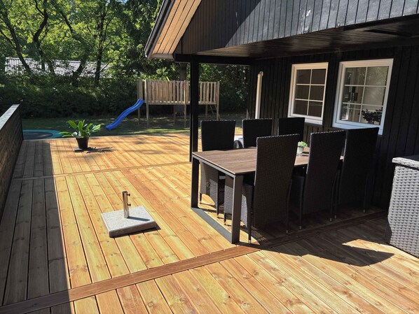 Outdoors, you can enjoy the large, sunny 85 m² wooden terrace with garden furniture, a grill, and
