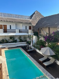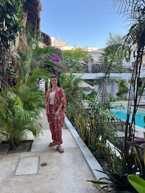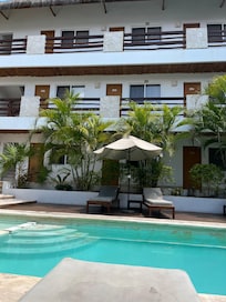 Kimberly at the front desk was great. She had good recommendations and spoke some English, and what we couldn’t communicate with my bad Spanish or her English, she was super patient to use a translator. The pool was a great hang out and refreshing. The location was so perfect fo getting into town and the mini fridge in my room helped us keep fresh water and some minimal food for snacks and healthier options. The room was spacious and the beds were comfortable. I gave cleanliness a 4 because my room garbage wasn’t emptied while I was there and on the smoking balcony the ash tray was never emptied either. The closet was in the bathroom, which I think was a bad location and hard to use. Also, in the bathroom the sink vanity was worn out from the water and humidity. It was hard to take a shower without making a mess of water because of the half glass. I would stay here again for sure.