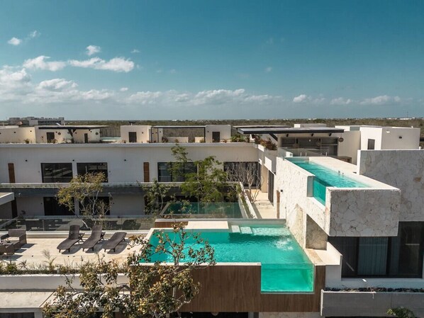 Tucked away in the jungle, this apartment offers a bohemian retreat with oversized plunge pool and king beds. Enjoy a lagoon-style pool or bask in the sun at the rooftop lounge area, then stay active with fitness center access and convenient laundry facilities.