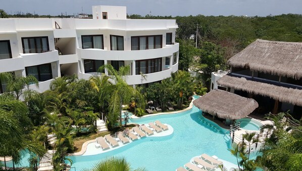 Experience the essence of Tulum's Adults Only Paradise at Intima Hotel, where you can unwind in a private heated jacuzzi on your balcony. Enjoy a swim in the beautiful pool area with a shared jacuzzi and grab a drink from the pool bar nearby.