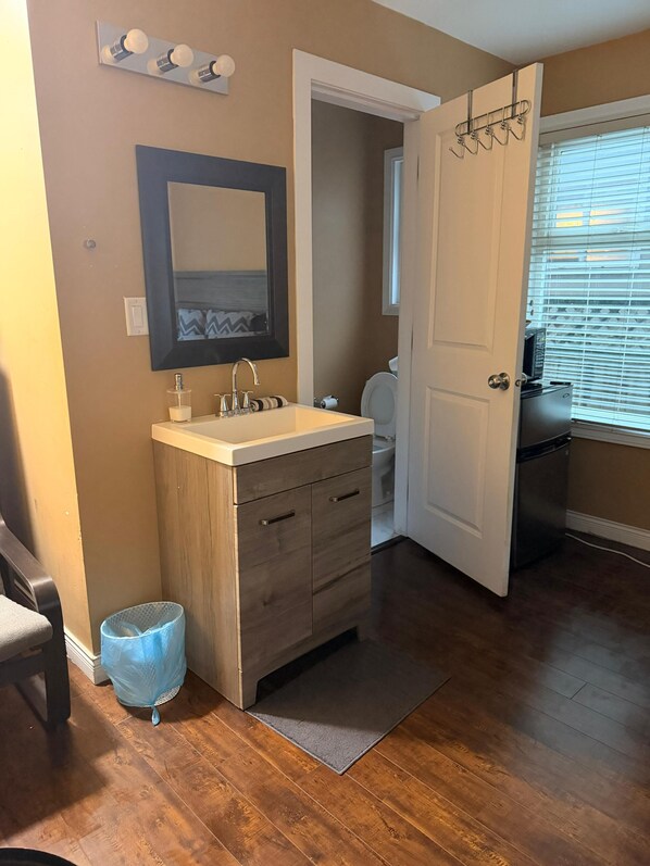 Small, renovated, private 1 bedroom bathroom in front of bus stop to downtown.