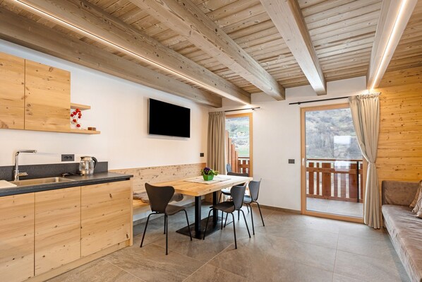 First-floor apartment with access via a private terrace. The spacious kitchen-living area features large windows overlooking the mountains above Vermiglio and access to the balcony.