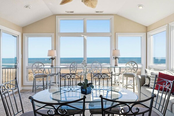 We all need a little “Quiet Time” these days! Find yours at this beautiful oceanfront beach house with panoramic ocean views, tasteful furnishings, and artful décor. We can't wait for you to walk up the stairs to that jaw-dropping view from the wall-to-wall and floor-to-ceiling windows overlooking the beach and the Atlantic Ocean! Your family will be able to spread out in this spacious destination and the quality furnishings and bedding offer comfort for everyone in the family. You will enjoy decks with ocean views on both levels and the mid-level deck has decks wrapping two sides, giving ample space to relax and enjoy your family.