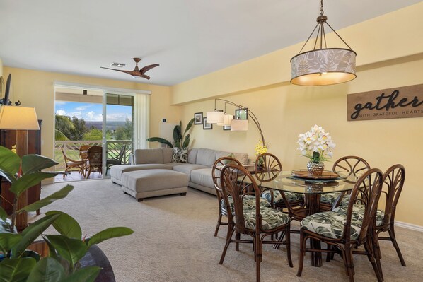 Waikoloa Fairway Villas C21, a beautifully upgraded 2-bedroom vacation rental, offers easy access to Waikoloa Beach Resort amenities. Relax in the spacious living room with a wall-mounted big screen LCD television or unwind on the lanai while taking in views of the golf course and listening to swaying palms.