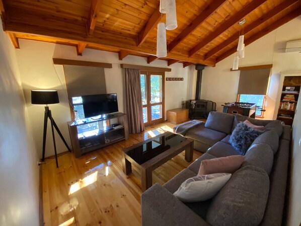 Inside you’ll find three comfortable bedrooms, open plan kitchen, dining & lounge with plenty of seating. A vintage book shelf holds books for adults and children, games and speakers for all your music needs. Snuggle up by the wood fire in winter with a glass of wine after a busy day in the great outdoors. Reverse cycle heating and cooling as well as ceiling fans provide year-round comfort.