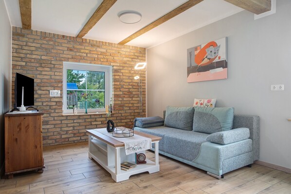 Historic building materials like beams and bricks give the apartment character, while the modern fitted kitchen is equipped with a dishwasher, fridge, microwave, and coffee machine. The ground-level design with wide doors is especially suitable for seniors.