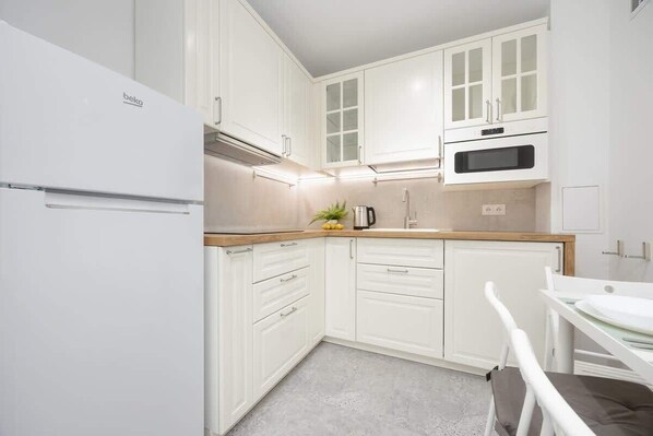 Refrigerator with freezer, induction cooktop, extractor fan, electric kettle, microwave, table with chairs, glasses, cookware set, cutlery, frying pan, washing machine.