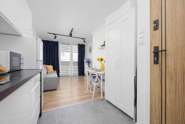 This modern studio located in the heart of Warsaw is an ideal option for couples looking for a comfortable place for a relaxing city break, a romantic weekend or a longer stay. The premises are located on the fifteenth floor and offer everything needed for both relaxation and work. The interior is designed in a minimalist style, but not without cosiness - bright colours, natural light and carefully selected decorations create an atmosphere conducive to relaxation. The bedroom area is furnished with a sofa bed and there is a small dining table next to it. An ergonomic desk has been placed right next to it, which - combined with a high-speed WiFi connection - makes this studio the perfect base for remote work or online learning. The living space also features a flat-screen TV with SmartTV+ function, allowing you to enjoy access to your favourite streaming services. The kitchenette allows for complete independence - a hob, microwave, electric kettle, as well as a set of crockery and pots and pans are available. The modern bathroom is equipped with a spacious shower for a quick and convenient refreshment. There is also a hairdryer, a set of fresh towels and elegant, hotel-quality bath toiletries. The studio is suitable for up to two people. Thanks to its central location, guests have easy access to cafes, restaurants, services and tourist attractions - everything is within walking distance.