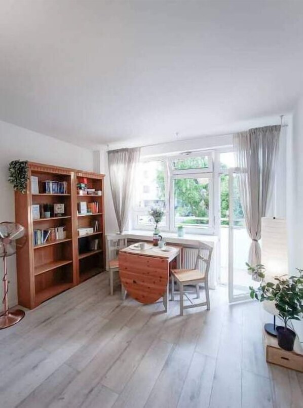 Imagine yourself in a stylish, 2-room apartment with a balcony, nestled in a quiet neighborhood surrounded by greenery. Enjoy fast internet and modern comforts like a dishwasher and wine fridge while working remotely or relaxing in the park next door.