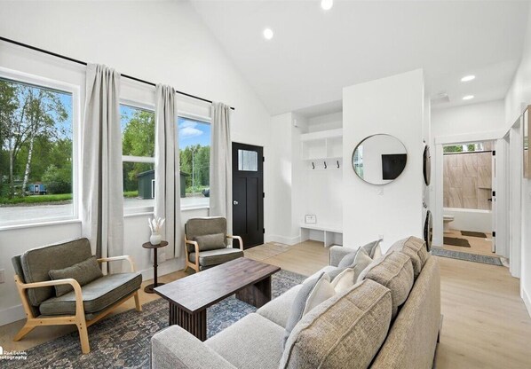 My friend and I stayed in Unit B. It was beautiful, clean, and well located for our adventures. It was well stocked with pans, dishes, hair dryer, and other basics plus some thoughtful items. The two bedrooms plus 1 full bathroom and 1 half bathroom were perfect for us. I loved the high ceilings, the calm color scheme, and the kitchen with the big dining island was gorgeous. There is even a washer and dryer. The host was very responsive and communicated well. We will definitely stay here when we visit our Palmer friends again.