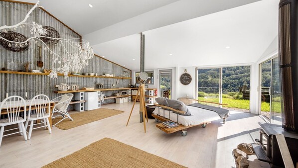 This converted barn has been stylishly recreated using recycled materials to make the perfect location for your next weekend getaway. The open plan living area is filled with light and has a comfy day bed where you can sit back and take in the stunning view or keep yourself warm in front of the slow combustion wood fire (firewood provided from May-September); there's also reverse-cycle air-conditioning.