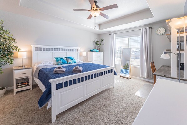 The primary bedroom is the perfect spot for working remotely, or not, with a large desk and an additional charging station. It also has speakers that can be hooked in to your phone or laptop. The mattress is a Hybrid, medium-firm. In the spacious primary bath you will find double sinks and a walk in shower as well as a tub/shower combination in the hallway bath.