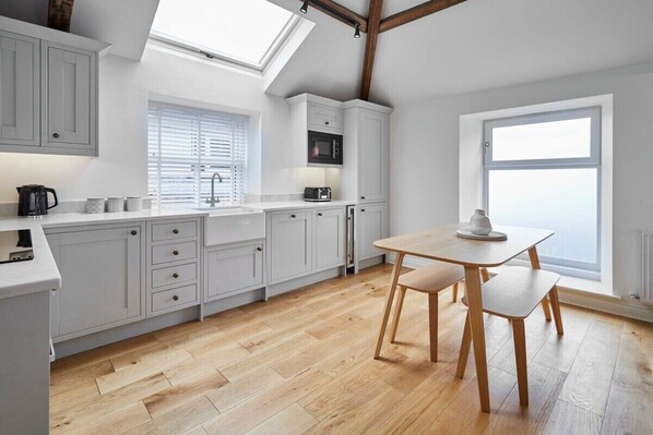 The heart of 3 The Mount is the open-plan living and kitchen area on the ground floor. A wonderfully bright and spacious area, you'll be able to enjoy special moments with your family and friends. Exposed ceiling beams allow for a traditional feel to run throughout this modern property. Whether you are unwinding in front of the flat screen TV or getting lost in a good book, you will enjoy the peaceful surroundings of Whitby’s West Cliff.