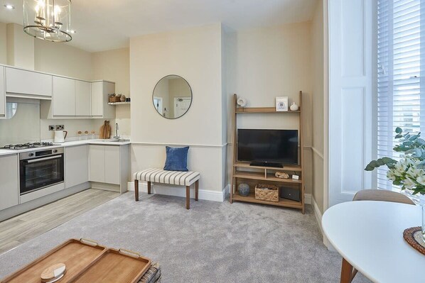 Silver Beach has an open plan living, kitchen and dining area where you can relax during your stay. Featuring a comfy grey sofa and a new Bush 40" Smart TV, you can cosy up here after a busy day exploring Whitby.