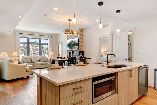 The ambiance of Timber Fox Luxury Condo 3203 is warm and inviting, enhanced by a gas fireplace that creates a cozy atmosphere for relaxing evenings. The open-concept living area is perfect for gathering, complete with a large TV and home theater system for entertainment. The fully equipped kitchen boasts modern appliances, including a refrigerator, stove/oven, dishwasher, and microwave, along with all the necessary dishes and utensils to prepare your favorite meals.