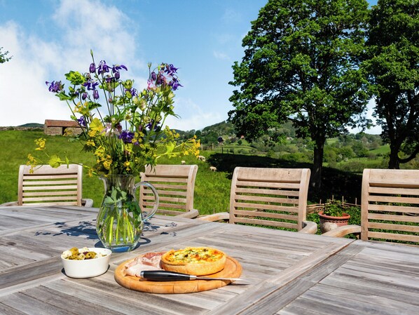 Upstairs there are six generous bedrooms, each with its own character. All of the bedrooms are beautifully decorated and furnished, with deep pocket sprung mattresses and luxurious bed linen. You can guarantee that you will have a deep night’s sleep, waking refreshed and ready to explore the scenic Yorkshire Moors. There are three kingsize beds, one with en-suite facilities, and three with twin beds. Outside, relax in your very own hot tub in the privacy of an established orchard, as you are surrounded only by nature. Village pub and shop within 1 mile, with alternative pubs and restaurant within 5 miles.