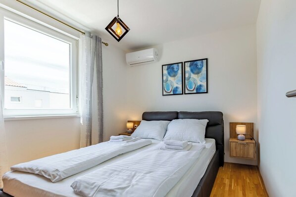 In the heart of Zadar, this 1-bedroom apartment offers a peaceful retreat with a cozy bedroom and comfortable full bed. Stay connected with WiFi, and enjoy the convenience of amenities like hair dryers, washing machine, AC and heating.