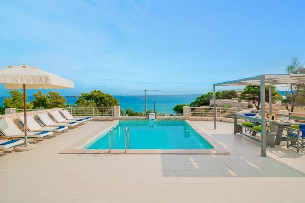 Villa Chrysso offers spectacular sea views from the fabulous pool terrace, communal spaces and the first floor balcony. A clever blend of traditional and contemporary, the villa is a great place for families and friends to relax and unwind. You'll be just a minute's walk from the seafront and only a 5 minute drive from the beautiful beach, bars and restaurants of Alykes. WiFi and air conditioning/ heating in the bedrooms and kitchen are included.