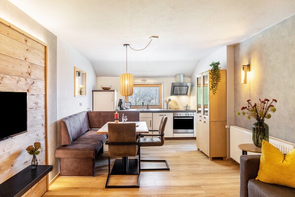 The Wald apartment in Zellberg offers 60 m² of space for up to 4 guests. It features 1 bedroom with a double bed and a bunk bed for two children, separated by a wall, as well as 1 bathroom with a walk-in shower, toilet, and sink with hairdryer. In the living kitchen, you will find a cozy corner bench and a satellite TV with streaming device, so you can enjoy your favorite shows in your language. The fully equipped kitchen leaves nothing to be desired. Private amenities include a balcony, a workspace, Wi-Fi, and TV.