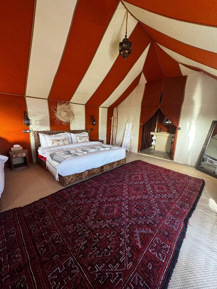 Shared group experience: standard desert camp with shared bathroom facilities. Tents are simple & traditional. Groups of 2+ have a private tent. Solo travellers may share a same-gender tent with up to 4 guests.