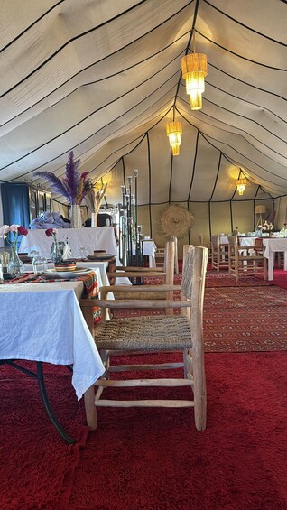 This option follows the same standard camp setup as above but starts in Marrakech and ends in Fes (no accommodation in Fes included). Groups of 2+ have a private tent. Solo travellers may share a same-gender tent with up to 4 guests.